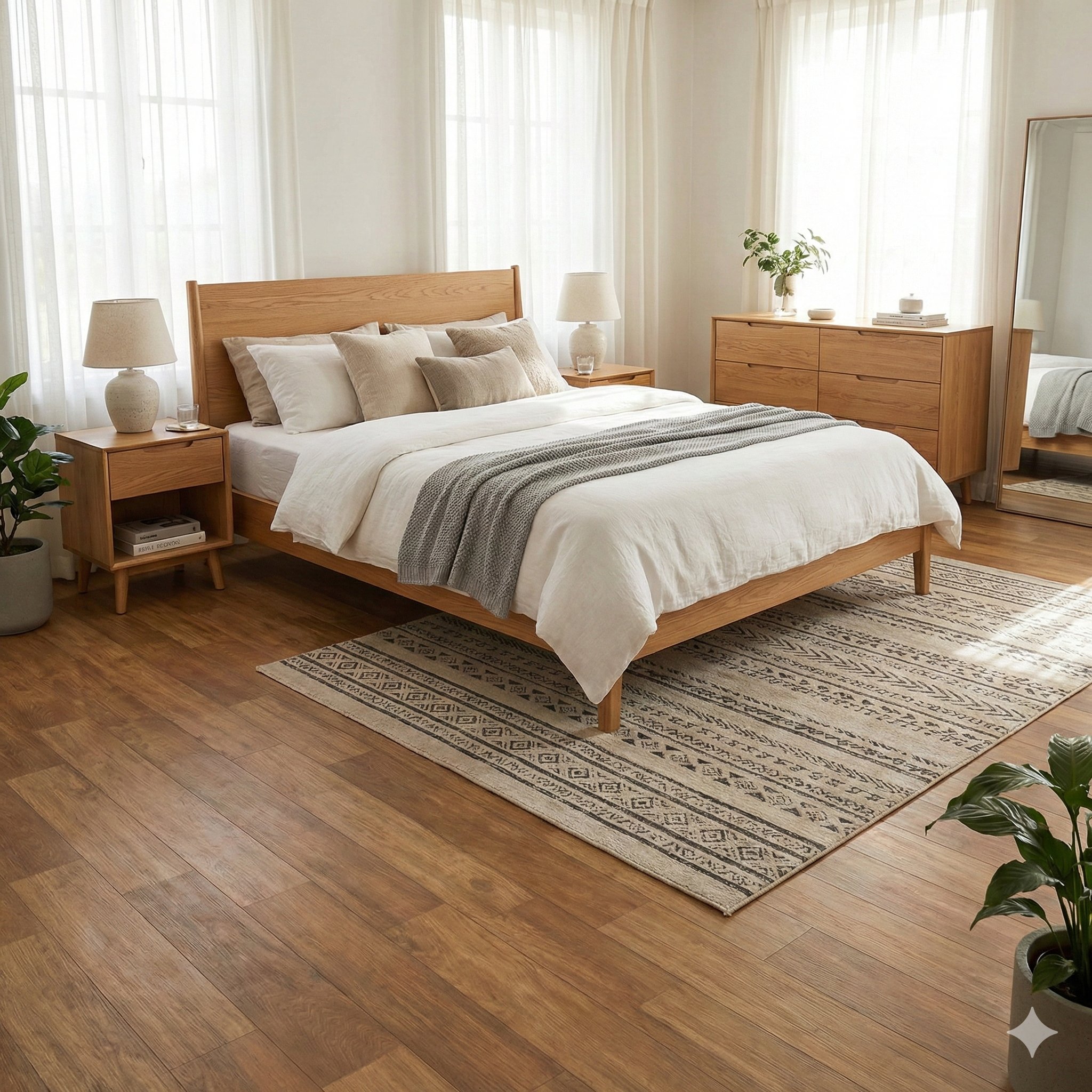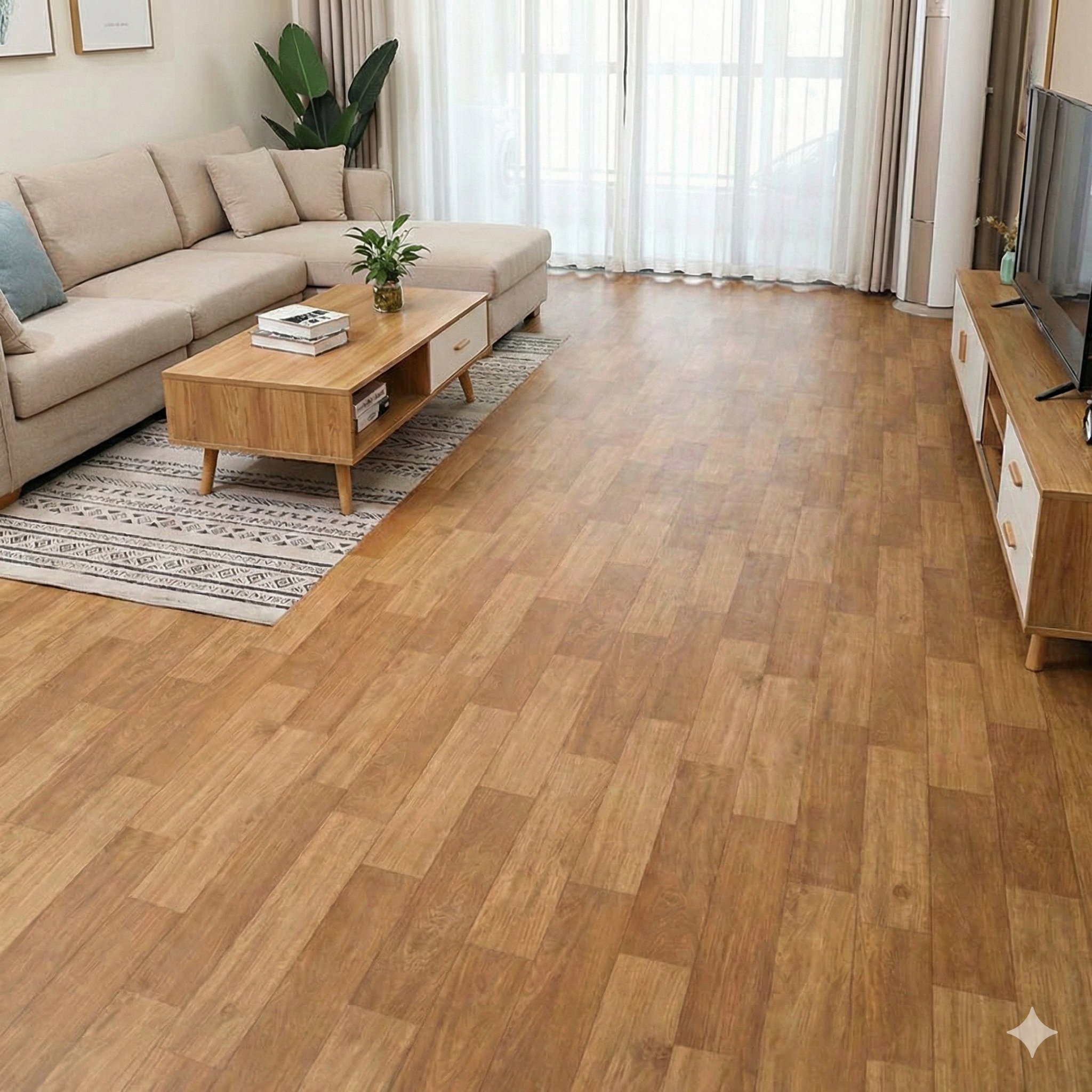 • Living rooms & bedrooms: Adds a cozy wood-like feel